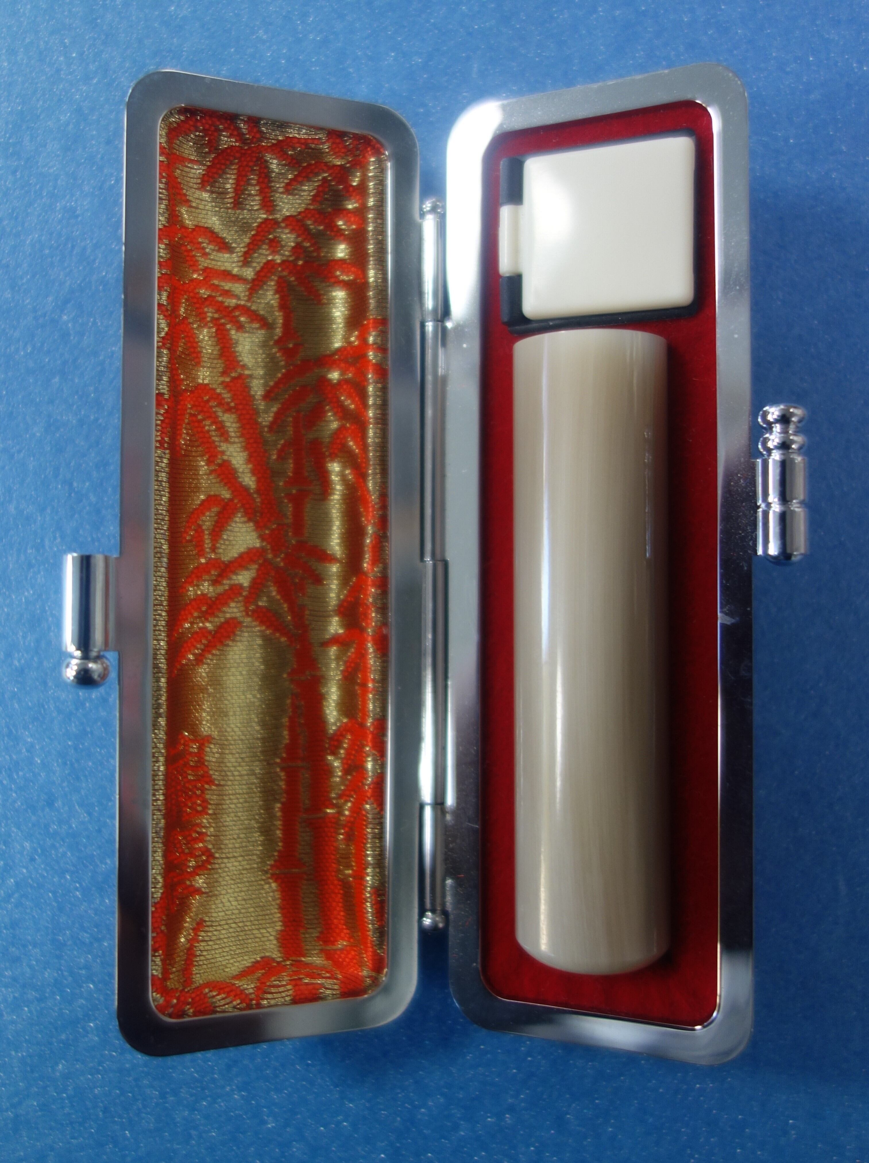 材料は、牛角(白)芯持 15ミリ丸×60ミリ丈の材料です。センターにはシールを貼ります。(センターとは、印影が真っ直ぐ捺せるという目印)